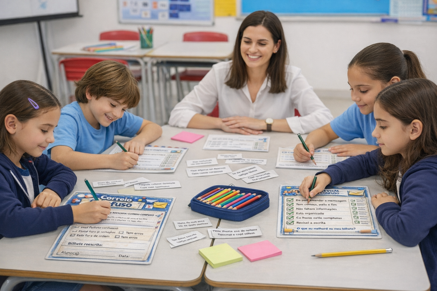 No Correio Confuso, os alunos recebem bilhetes e mensagens mal escritas, fora de ordem ou pouco claras, e precisam reorganizar, corrigir e reescrever para que a mensagem seja compreendida.